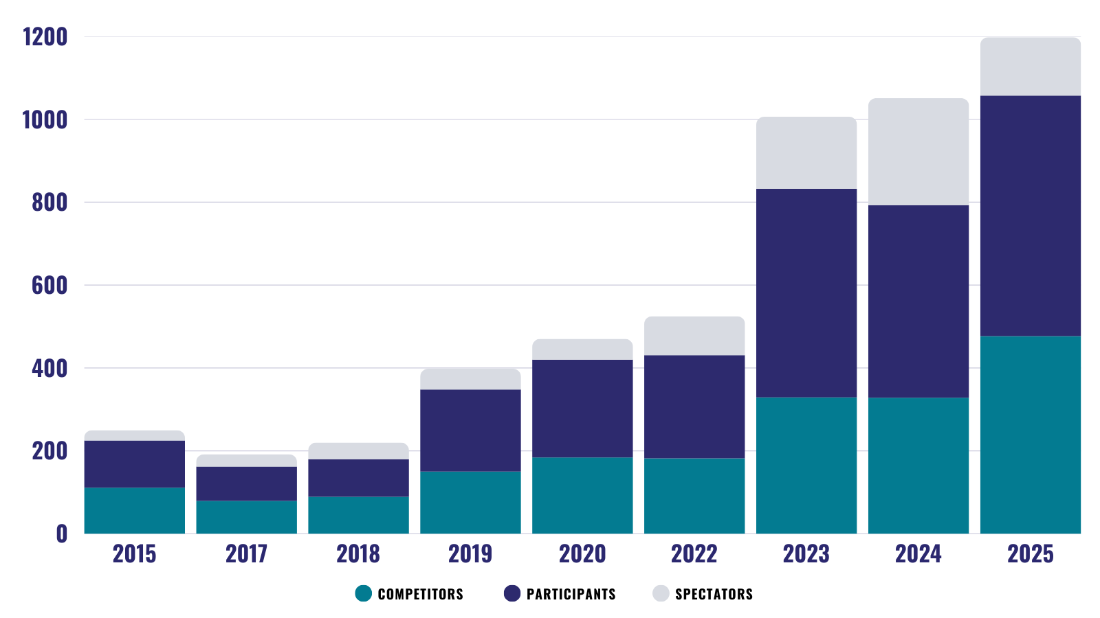 This area chart shows SoCal Swordfight’s rapid attendance growth, with total attendance increasing over 350% since 2015. The event attracts more competitors, participants, and attendees every year, reflecting its role as the world’s leading HEMA tournament and expo.
